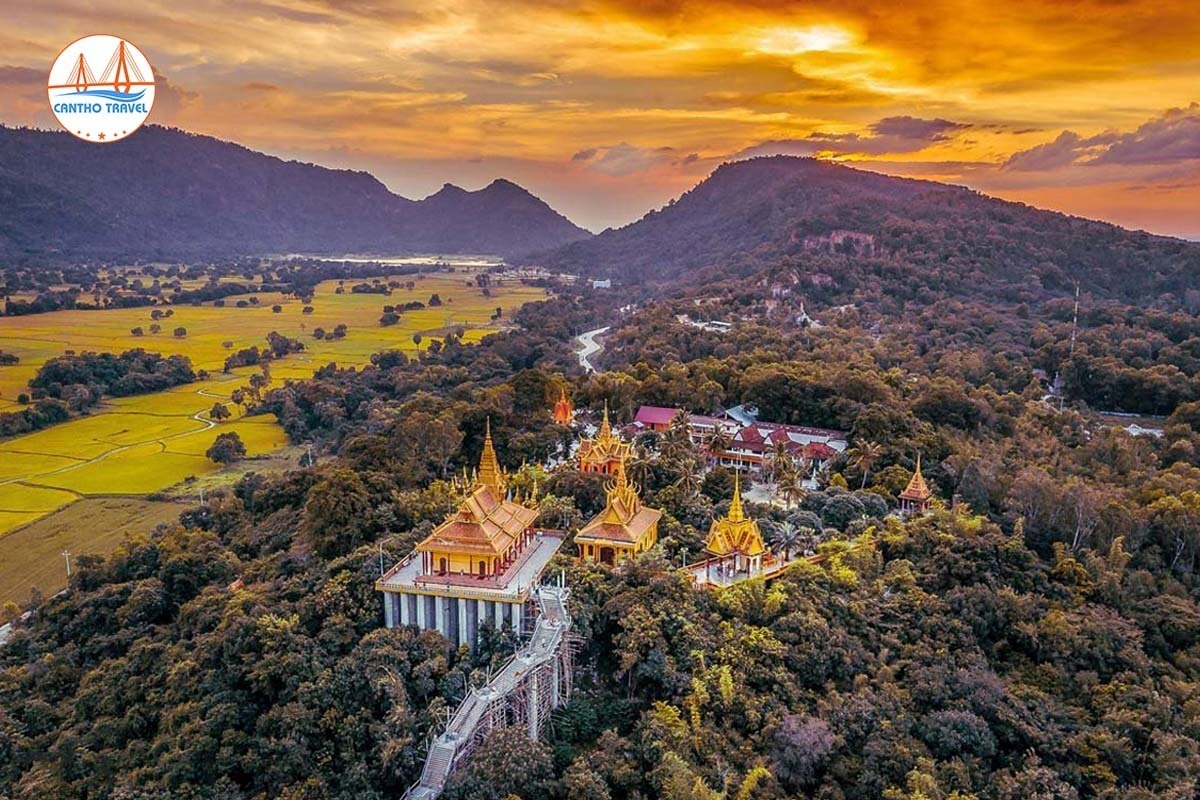 The group enjoys lunch inside Tra Su Forest with local specialties, and free time to rest within the melaleuca forest. Bus then takes the group to Ta Pa Pagoda — also known as “Mountain Pagoda” or “Chua Chon-Num” in Khmer. In addition to admiring the unique architecture of Ta Pa Pagoda and learning about the Southern-Vietnamese Khmer Buddhist culture, guests can soak up the fresh, green natural scenery. The pagoda sits on Ta Pa hill, rising up to 45m — surrounded by vast wild fields — adding a dignified and majestic aspect to the site.